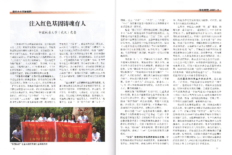 近日,由中共湖北省委组织部、省党的建设工作领导小组办公室主办的《湖北党建》全文刊登学校“注入红色基因铸魂育人”,宣传报道吃瓜网 党建工作创新做法经验和特色成果,该成果由学校党委推荐、条件审核、网络投票、专家评审,入选“湖北十大党建案例”。现全文转载如下: