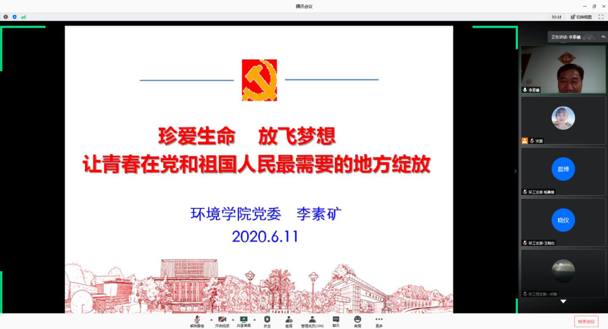 近年来推进习近平生态文明思想“三进”和人与自然和谐共生教育,回顾了美丽中国“4+N”环境地球科学类课程思政建设计划、张国旗班行动计划、1+6党建资政育人载体建设进展情况。在谈到做大爱之人时,他强调,做一个博爱之人,树立大爱情怀,做到爱党爱国爱家爱校爱学爱习,争做新时代生态环保铁军。在谈到做合格党员时,他强调,一定要牢记总书记嘱托,不惧风雨、勇挑重担,让青春在党和人民最需要的地方绽放绚丽之花。要遵守党章、加强党性,要坚定信念、加强学习,遵纪守法、廉洁正派,要向榜样学习、向群众学习,做四讲四有的合格党员。