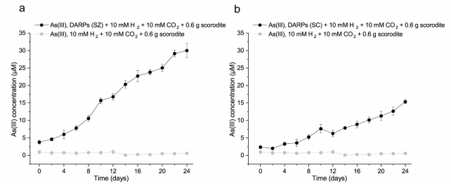 图3: DARPs介导的与氢气氧化偶联的毒砂中固相砷还原性释放。
