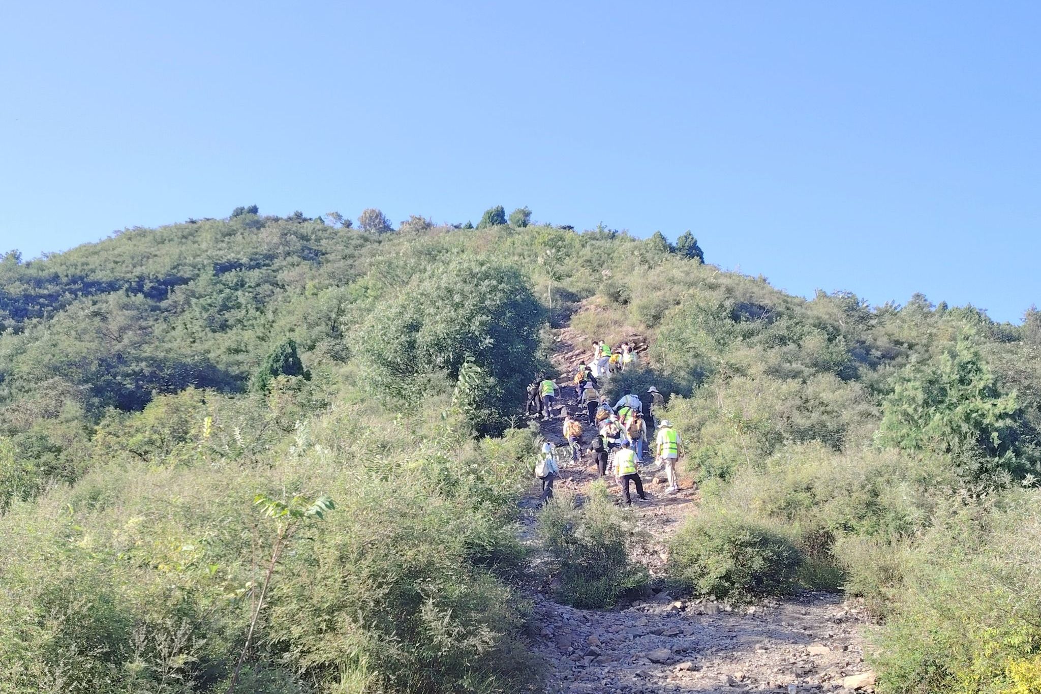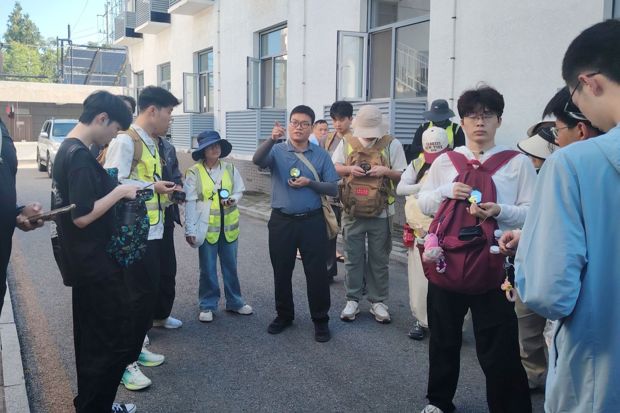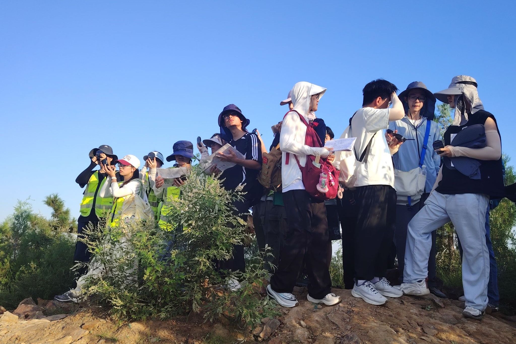 下午,全体师生前往太平山南坡踏勘,进行罗盘使用和后方交会法等实际操作练习。