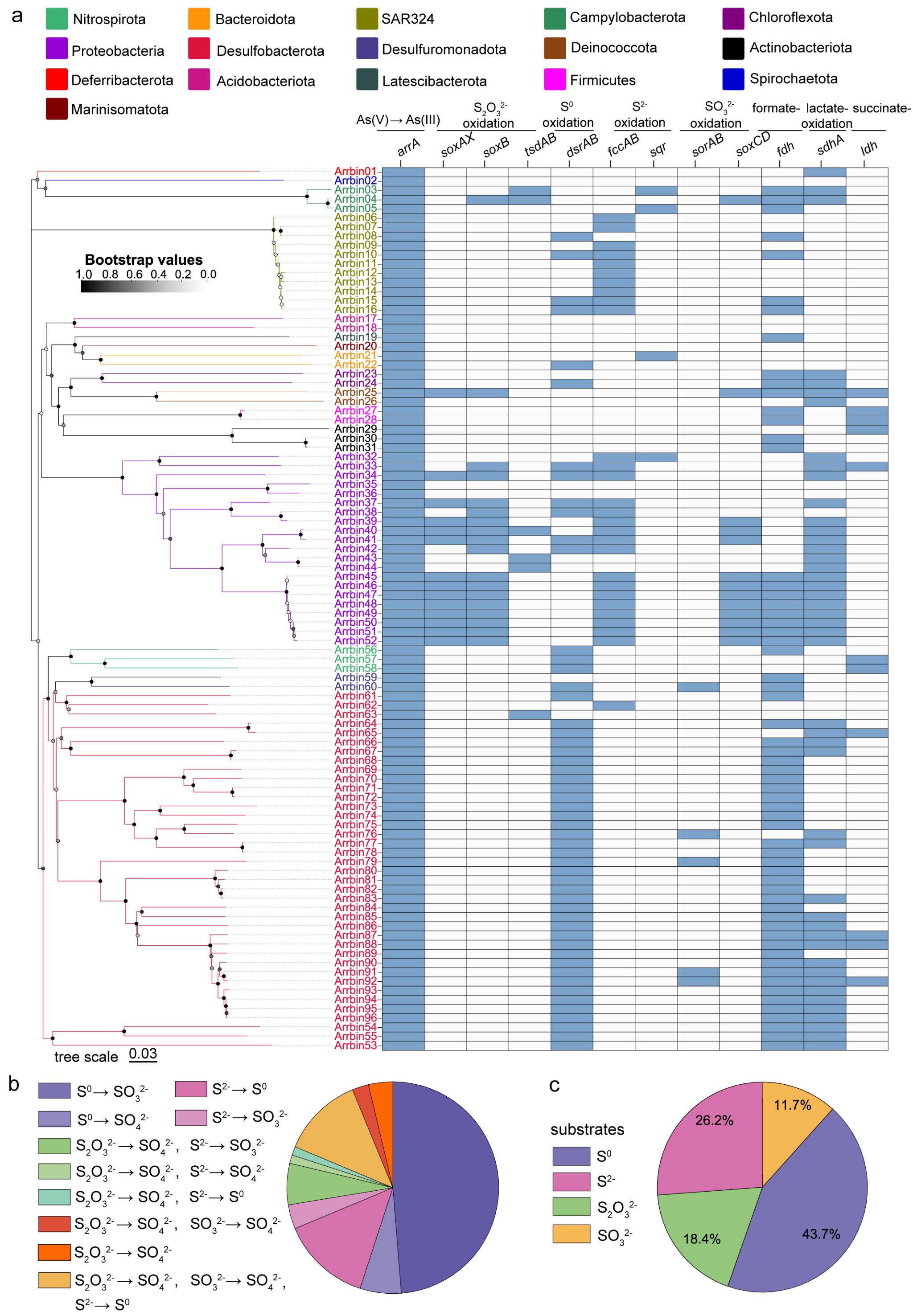研究团队采集了不同污染程度的砷污染土壤样本,并制备了三种富集培养液(AssL、AssM、AssH),其中DARPs能高效将As(V)还原为As(III)。从其宏基因组序列中获得了多个高质量 MAGs,大部分含有完整的Arr酶,表明它们属于DARP MAGs(Arrbins)。进一步分析发现,84%的Arrbins至少具备一种还原性硫化物氧化能力,且基因组系统发育结果显示它们分布于 Desulfobacterota、Proteobacteria等多个门类。不同门的Arrbins在硫化物氧化途径上具有独特特征:如Desulfobacterota仅具S⁰氧化途径,而Proteobacteria则具多种途径。根据所含硫氧化酶类型,Arrbins可分为十个亚群,能利用S⁰、S₂O₃²⁻、S²⁻和SO₃²⁻作为底物(图1)。