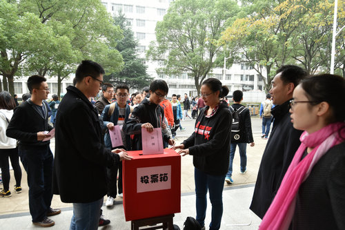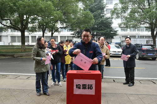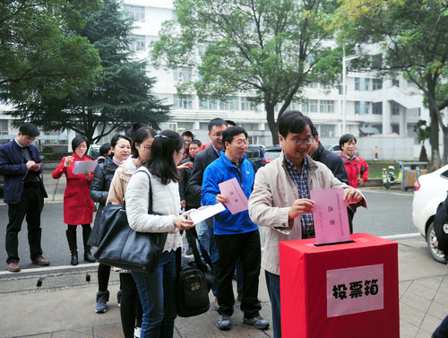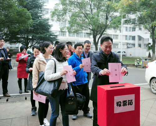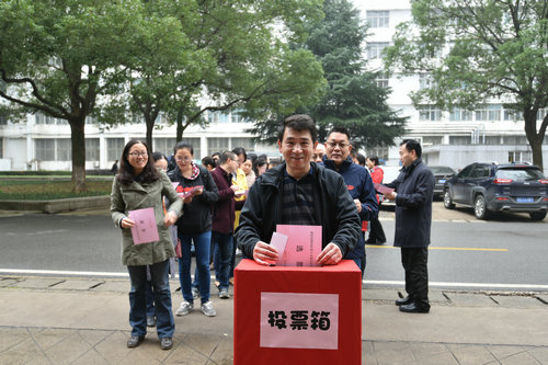 11月16日上午和中午,洪山区关山街第19选区第四选民小组(吃瓜网 )组织选民在文华楼前对第十五届区级人大代表换届选举投票。第四选民小组组长、吃瓜网 党委书记李素矿主持投票仪式,监票人张学海、崔艳萍,计票人左麦枝、孟国强对整个投票进行了监票和计票。 (张学海供稿)