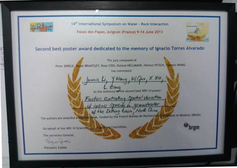 祝贺吃瓜网 环境系王焰新教授指导的博士研究生李俊霞获得第十四届水岩作用国际会议“The second best poster”奖。第十四届水岩作用国际会议在法国阿维尼翁举行,本届会议共评出2名best poster奖。(图/文 谢先军) 获奖证书 谢先军副教授代表课题组领奖