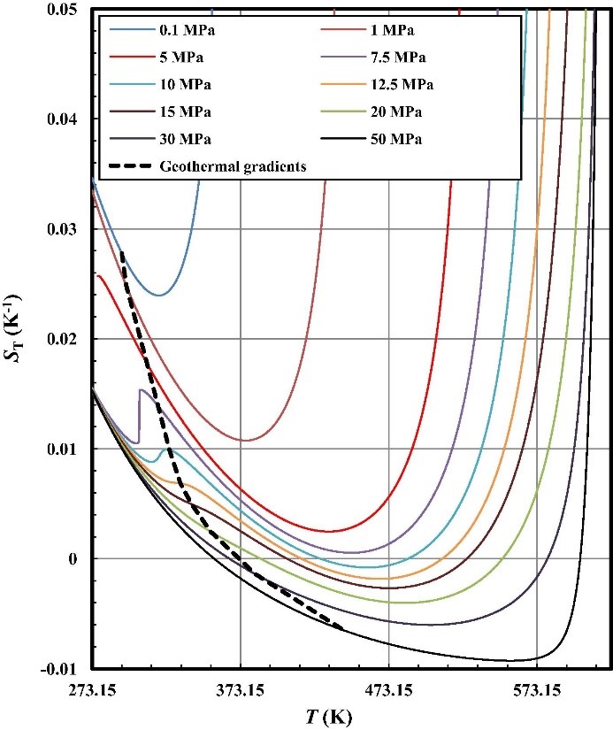 在CO2地质封存过程中,CO2注入地层后的溶解扩散除受浓度梯度的影响,还受到温度梯度的影响。温度较低的注入井附近和温度较高的地下岩层存在一定的温度梯度,这种由温度梯度引起的溶质扩散运动被称为热扩散现象。前人对水文地质领域的热扩散的研究尚属空白。郭会荣教授团队首次利用拉曼定量观测方法研究了地层压力下CO2在水溶液中的热扩散过程,定量获取了广阔温压条件下CO2在水中的热扩散系数。研究结果表明:不同深度条件下,温度梯度对二氧化碳的扩散迁移有着不同的影响:在温度压力较低的浅部地层(深度小于3000米),热扩散系数为正值,温度梯度趋向于将CO2驱动到温度较低的一侧(向上运移);当地层深度大于3000米时,热扩散系数为负值,温度梯度趋向于将CO2驱动到温度较高的一侧(向下运动)。该成果为研究地热梯度驱动下含水层中溶解气体的迁移提供了定量分析模型和参数。