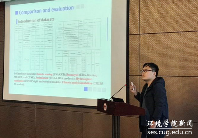 特任副教授顾西辉老师在会议上进行了交流。他提出:在欧亚大陆的土壤水分干旱有显著的强化和扩张,这是降水减少和气温升高共同作用的结果。降水的变化影响着土壤水分变化的方向,而温度的升高决定着干旱的程度。降水和温度的影响取决于蒸发蒸腾作用,并可以提取干旱过程中的全球变暖信号。他发现全球土壤水分减少4.2×10-3m3 / m3,温室气体的贡献50%。