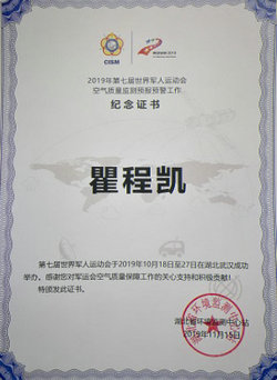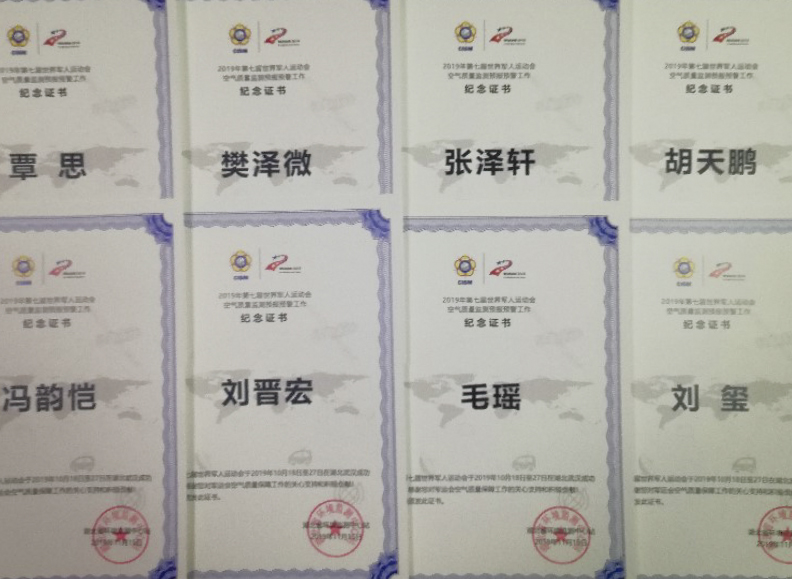 这封感谢信是由湖北省环境监测中心站发出的,随同寄来的还有颁发给大气环境团队5位教师、25位研究生个人的“2019年第七届世界军人运动会空气质量监测预报预警工作”纪念证书。纪念证书中提到“第七届世界军人运动会于2019年10月18日至27日在湖北武汉成功举办,感谢您对军运会空气质量保障工作的关心支持和积极贡献。”