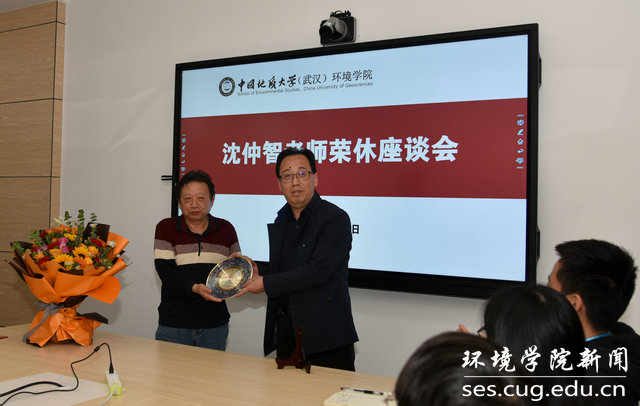 张学海和实验中心副主任梁莉莉代表教职工和工会为沈仲智老师赠送鲜花。