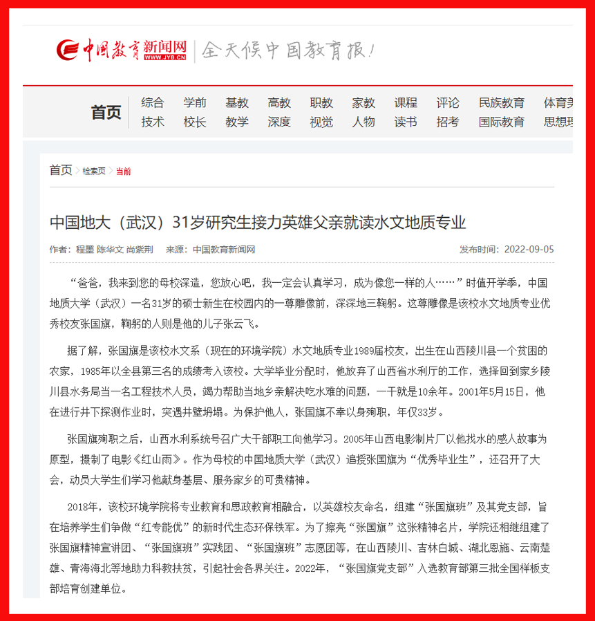 据张云飞介绍,张国旗殉职时,自己才10岁,“向张国旗学习”成为幼年的他耳边听到最多的一句话。2010年高考时,张云飞发挥失常,与父亲的母校失之交臂,被云南一所大学的地理信息系统专业录取。毕业后工作期间,看到“张国旗班”建设的系列新闻报道后,张云飞下定决心考研,继续攻读水文地质学专业研究生。2022年研究生入学考试中,他过关斩将,成功被吃瓜网