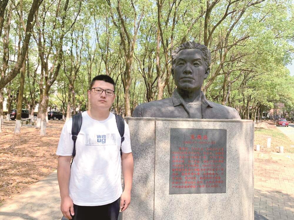 (武汉)新生开学,31岁的硕士研究生新生张云飞,在地大校园的一尊雕像前,深深地三鞠躬。