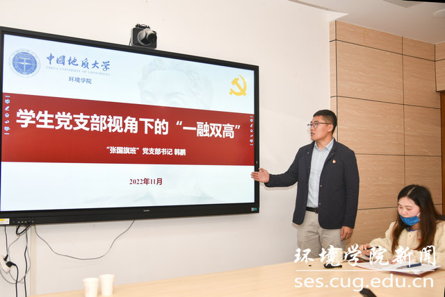 全国党建工作样板支部“张国旗班”党支部书记韩鹏就“一融双高”作专题分享,他从“建设背景、建设特色、建设举措和建设成果”等方面介绍了学生党支部视角下的“一融双高”。他谈到,“一融双高”建设将助推学生党支部党建与学业学术深度融合,锻造红专能优新时代生态环保铁军,让青春在全面建设社会主义现代化国家的火热实践中绽放绚丽之花。