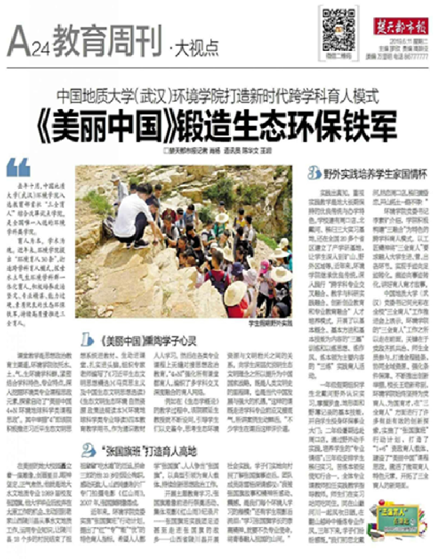 在全国20多个省区建立产学研基地,让学生深入到矿山、野外区域等提升专业本领,培养专业情怀。每年一册的《师生野外实习风采展》,生动记录和展现了环境学生行走在山水林田湖草沙间躬行的身影。学生走进社区、中小学校开展习近平生态文明宣讲,溯江而上奔赴长江源科考一线,在实践中不断擦亮新时代大学生社会主义生态文明观的底色,把论文写在祖国大地上。