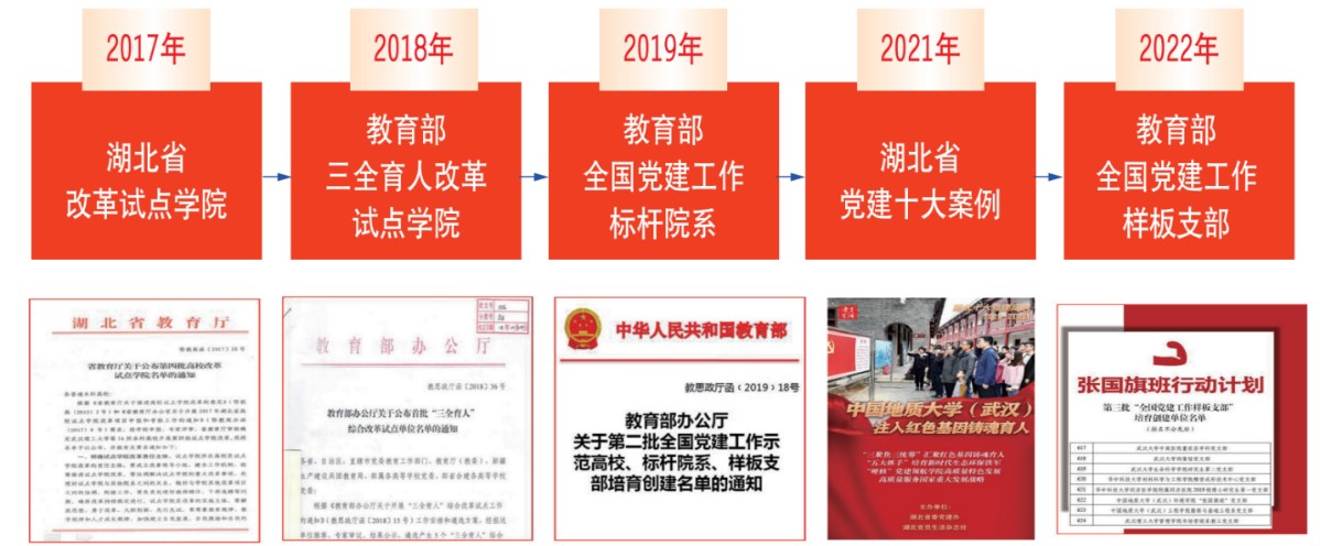 、第二批全国党建工作标杆院系,“张国旗班”党支部入选第三批“全国党建工作样板支部”,党建成果“注入红色基因铸魂育人”入选2019-2020湖北十大党建案例。