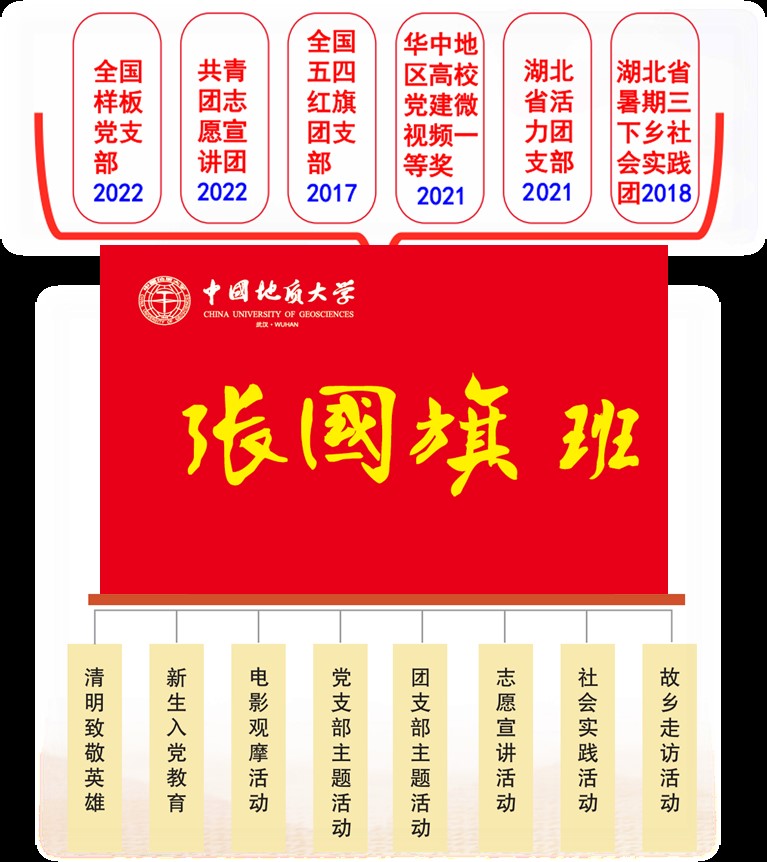 党委实施以英雄校友张国旗命名的“张国旗班”行动计划,校党委书记黄晓玫作序,校党委副书记、校长王焰新题词,设立了张国旗党支部、团支部,组建了社会实践团、宣讲团,围绕“三大攻坚战”、乡村振兴、长江大保护国家战略和“学习之路”系列教育奔赴全国各地开展社会实践活动,彰显典型引领效应,榜样的精神得以传承和发扬。“张国旗班”党支部入选第三批“全国党建工作样板支部”,“张国旗班”团支部获湖北省百生讲坛活力团支部金牌团支部,“张国旗班”实践团获湖北省暑期三下乡优秀团队,“红、专、能、优”的生态环保铁军基因深深植入师生的学习生活工作中。
