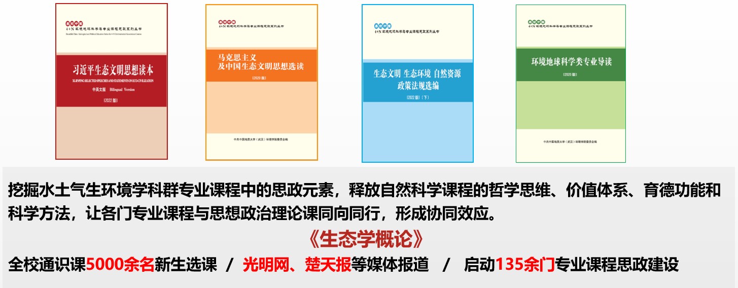 充分挖掘水土气生环境学科群专业课程中的思政元素,将知识传授、能力培养与价值引领有机融合,推出美丽中国“4+N”环境地球科学类课程思政模式,即《习近平生态文明思想读本》《马克思主义及中国生态文明思想选读》《生态文明 生态环境 自然资源 政策法规选编》《环境地球科学类专业导读》四本环境地球科学类课程思政系列丛书和覆盖135门专业课程的课程思政体系。四本指导教材已经在每年全校5000余名学生中使用。通识课《生态学概论》自2019年开讲以来,实现了全校本科生和留学生全覆盖,编印3册《生态学概论学习心得集锦》。