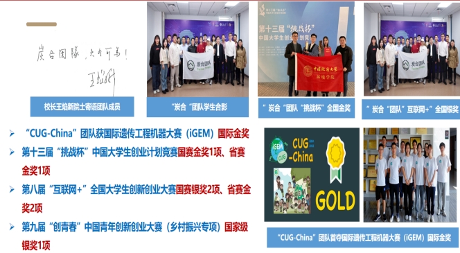 持续激发创新创业活力,培养拔尖创新人才。2022年,学生科创团队成绩斐然。“CUG-China”团队获国际遗传工程机器大赛(iGEM)国际金奖1项,“炭合”团队获第十三届“挑战杯”国赛金奖1项、第八届“互联网+”国赛银奖2项、铜奖2项,第九届“创青春”国家级银奖1项。