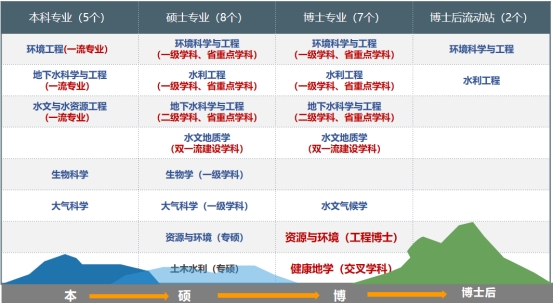 现有环境科学与工程、水利工程、地质学(共建)、地质资源与地质工程(共建)4个博士后流动站。环境科学与工程、水利工程2个一级学科博士点,水文地质学、地下水科学与工程二级学科博士点;有环境科学与工程、水利工程、生物学及大气科学4个一级学科硕士点,以及资源与环境、土木水利两个专业学位点。其中,水文地质学属国家一级重点学科的二级学科,环境科学与工程、水利工程、地下水科学与工程为湖北省重点学科。