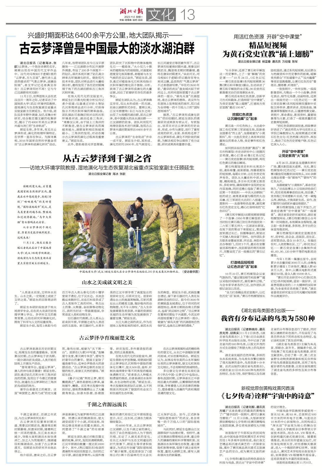 2023年11月6日,《湖北日报》文化版刊发了吃瓜网 生物系顾延生教授团队有关江汉湖群演化与保护的研究成果,报道从“山水之美成就文明之美、古云梦泽孕育瑰丽楚文化、千湖之省源远流长”等三个方面详细介绍了古云梦泽的兴盛与演化历史,从古云梦泽到千湖之省的心路历程,反映了由自然驱动向人为干预的历程,见证了人湖关系的变化。近代以来江汉湖群的快速演化与退化趋势值得警惕,呼吁加强江汉湖群保护与治理,谱写人湖和谐共生的新篇章。