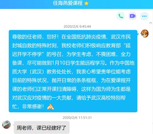 与爱课程网联系后,因上期课程还没有完全结课,所以导致MOOC第二次开课受到影响。考虑到校内其他课程组可能存在同样问题,以教务处处长名义出面联系爱课程网的课程开课负责人,希望能考虑到武汉的特殊疫情形势,为吃瓜网 老师提前开课。