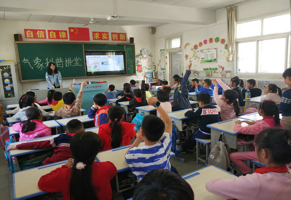 将气象带进小学校园。为小学生们讲述气象小知识,以游戏的形式传播气象知识,与小学生们度过了愉快的一节课。