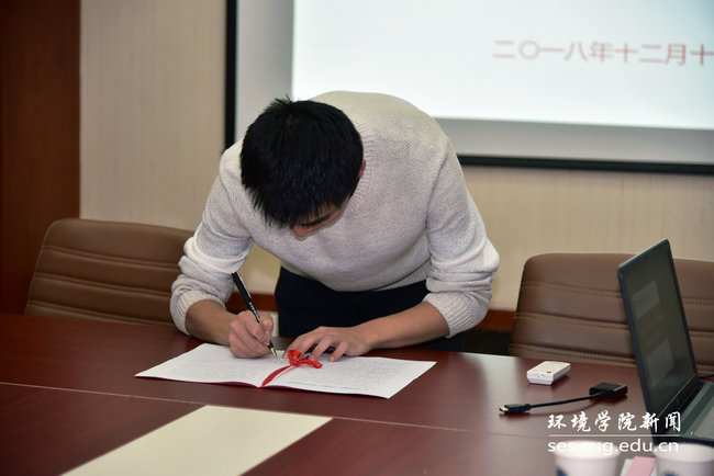 与会学生代表依次在倡议书上签名,共同约定遵守承诺,传承和发扬“严在地大”的优良校风学风,以自我的改变影响身边的人,携手追求卓越。