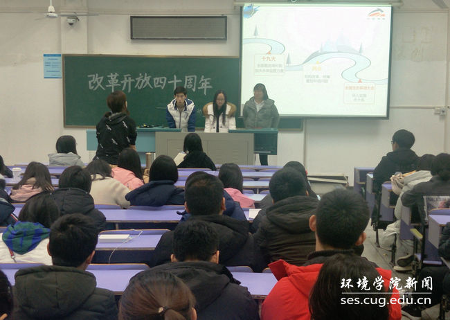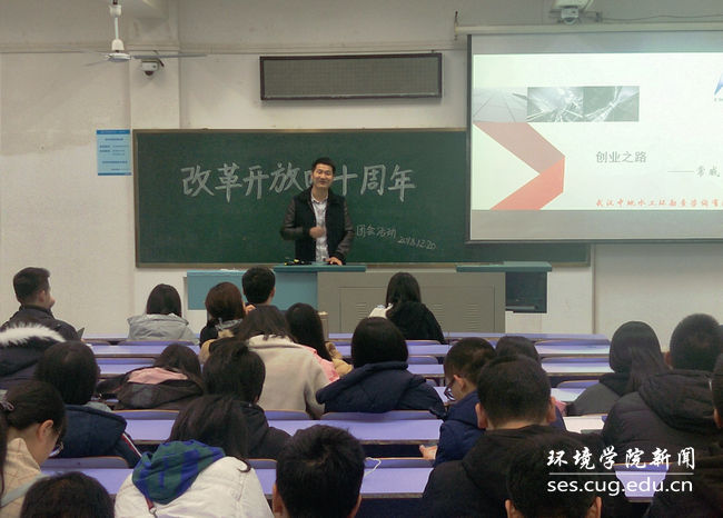 郭文杰团队向大家介绍了他们的互联网+项目:基于地质装备优化的环境监测系统以及团队在互联网+大赛的参赛经历,带领同学们熟悉了“互联网+大赛”这个陌生的词汇。