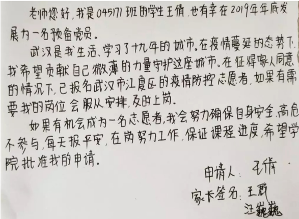 她说:“作为一名中共预备党员,在疫情蔓延的态势下,我希望贡献自己的力量来守护自己的家乡武汉,让疫情早日得到控制,让武汉早日恢复健康,在坚决打赢这场疫情防控阻击战中,践行初心使命,体现责任担当。”