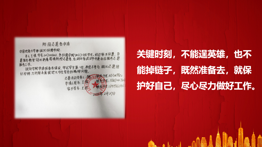 对我的关心和照顾,我很荣幸借此志愿服务机会展现了青年学子的担当和地大学生党员的精神风貌。我会继续完成好我的志愿服务工作,也希望疫情尽快消散,我们能尽快回到美丽的校园继续学习。”