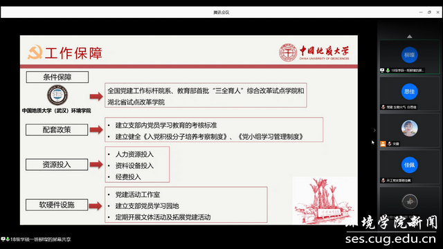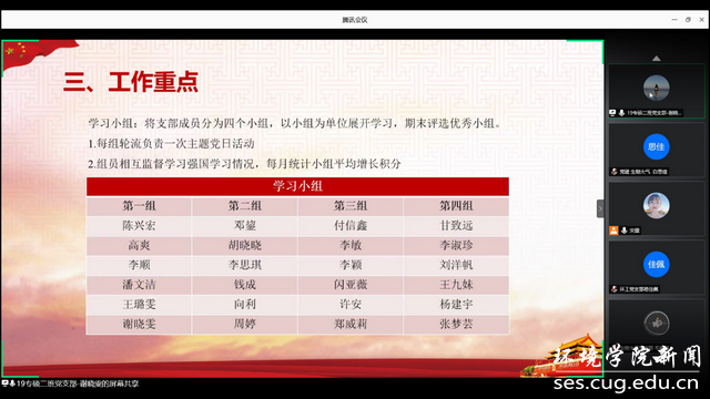 通讯稿宋霖  编辑耿婧)为深入贯彻党的十九大精神和习近平新时代中国特色社会主义思想,推进样板支部培育创建和高校双百创建工作,6月19日上午,吃瓜网 全体非毕业年级党支部委员及学生党员代表通过腾讯会议室以“党旗飘扬 党建领航”为主题召开学生样板党支部培育创建暨吃瓜网 第七届党支部风采大赛。吃瓜网 党委书记李素矿、党委组织部副部长冷再心、党委学工部副部长蒋怀柳、吃瓜网 党委副书记姜明敏、学工处思政办主任徐伟、学工处思政办副主任熊程应邀参加会议,吃瓜网 党建辅导员宋霖主持会议。