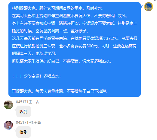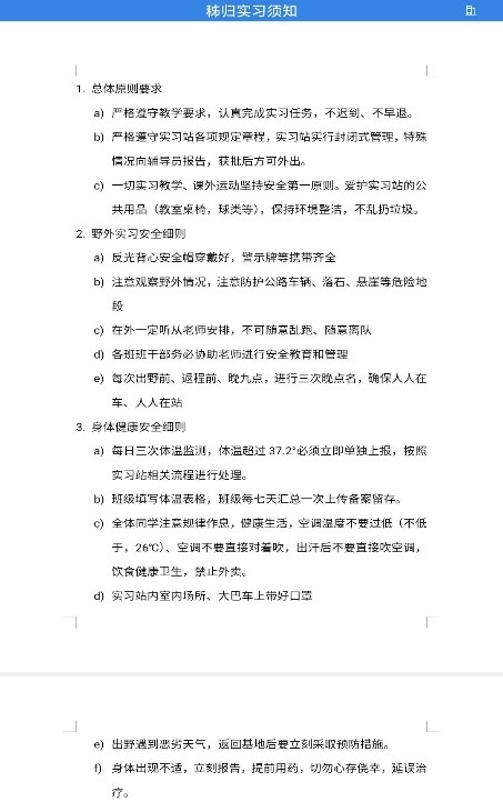 严格遵守疫情防控要求,细化在站疫情防控纪律,要求全体同学在公共场所戴口罩,每天早午晚三次报体温,在站实行封闭式管理,无特殊情况不得擅自离站。为保障饮食卫生安全,原则上不允许学生点外卖。同时,每天出野外时必须戴安全帽,穿荧光背心,带安全牌,严肃强调学生野外出行安全。在各班级干部得全力协助下,目前每个同学都能自觉遵守疫情防控纪律,疫情防控工作落实到位。
