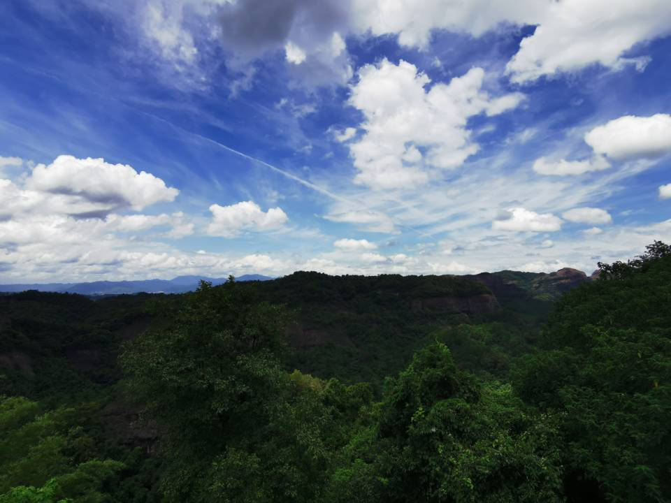 背起行囊,挥挥双手,告别家乡和父母,开启一段长达7个小时的高铁之旅,轻轻靠在二等座的柔软之上,看着窗外变换的风景,我知道我正在投向她的怀抱。努力地将行李推出窗外,迎接我们的是肆意倾洒的阳光和碧蓝如洗的天空。“韶关,不赖嘛。”身处河北霾都的时间久了,便在不知不觉中越来越珍惜遇见的蓝天了。乘坐上车站处的小面包,驶上蜿蜿蜒蜒的山路,我与她的距离越来越近了,想起这个,心跳便不由得加快了几分——仿佛我真的是要去见一位我早已倾慕已久却又素未谋面的姑娘。思绪逐渐飘扬,直到直立的上身突然前倾——到站了。丹霞山所处的地区远比我想象的要繁华,“嗨,原本我还担心找不到饭店吃饭呢”。更令我感到惊喜的是我们所住的旅馆就位于丹霞山地质公园入口不远处,远眺便依稀可见她羞红的双颊。入夜后闭了眼,今晚的梦中满是她若隐若现的倩影。