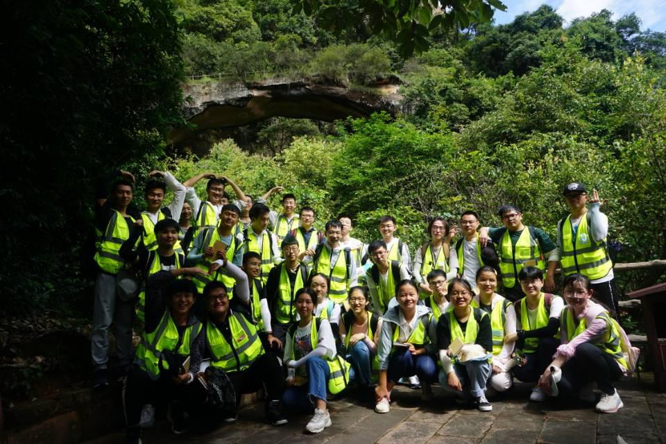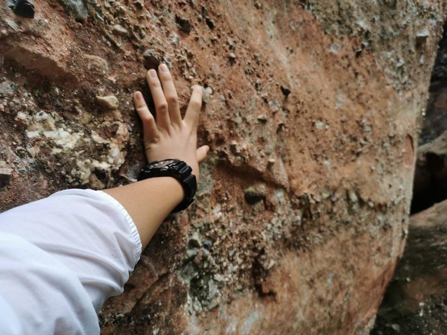 很多“第一次”都随时光定格在了这里——第一次遇见丹霞山、第一次书写野簿、第一次手掌罗盘找寻方位、第一次绘制地质素描图、第一次亲眼观察砂砾互层现象…我们也在这里收获到了很多:我们认识了这里的丹霞组地层,观察到了斜层理、古波痕构造、交错层理、差异风化现象,也了解到了很多地质现象的成因,如蜂窝状洞穴是由于砂岩受水流侵蚀形成等等。在我们下山后,这一砂一石的堆叠之中所蕴含的丰富知识犹令人回味。无怪乎世人叹曰:“层岩尽染读天书”。先进行地质实习的地点是丹霞山的长老峰景区,刚刚开始,这里陡峭的山路和盘旋的台阶就给了我们一个下马威,看来想一亲芳泽也不是那么容易啊。在脚步的一抬一放,身形的一行一顿之间,我们的在其后的两日中我们一点一点地揭开了她脸上的面纱,轻轻地触摸到了她羞红的面颊。丹霞山仿佛一位初出闺阁的姑娘,在我们大胆的示爱下愈发地羞赧,以至于唤来了云雨将自己藏于其后,只有在清晨和上午的些许时刻才羞答答地探出头脑,而未备雨具的我们慌乱躲于树叶的遮挡之下才免得被浇透的下场。不过,在我们逐渐地熟悉了之后云雨也便少了。甚至,她还赠予了我们颗颗饱满而通红的红豆,捡到的同学嚷嚷着要将这份爱意存好以便日后转赠给其他心爱的姑娘。有了前一日的铺垫,这两日我们书写野簿、学习和分析新的地质现象愈发地得心应手了。我们也在日晒和雨打之下感受到了地质人应有的不畏艰苦的品质和认真严谨的态度。