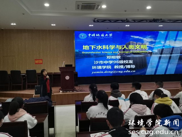 随后,邓娅敏教授面向沙市中学学生开展题为“地下水科学与人类文明”的科普讲座。她从地球上的水与水循环、井、泉与人类文明、地下水与生态文明、水的人生哲理等方面深入浅出地向同学们介绍了地下水相关知识,并与现场师生进行互动交流和感悟分享。她结合个人成长经历,勉励同学们认真学习,报考吃瓜网
