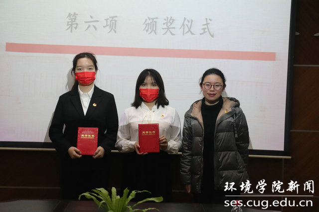 校团委组织宣传部主任陈文婷为获得三等奖的争做地大新青年队、啊对对队、四个意识牢记我心队、南望之声团队、东方朝阳队颁奖。