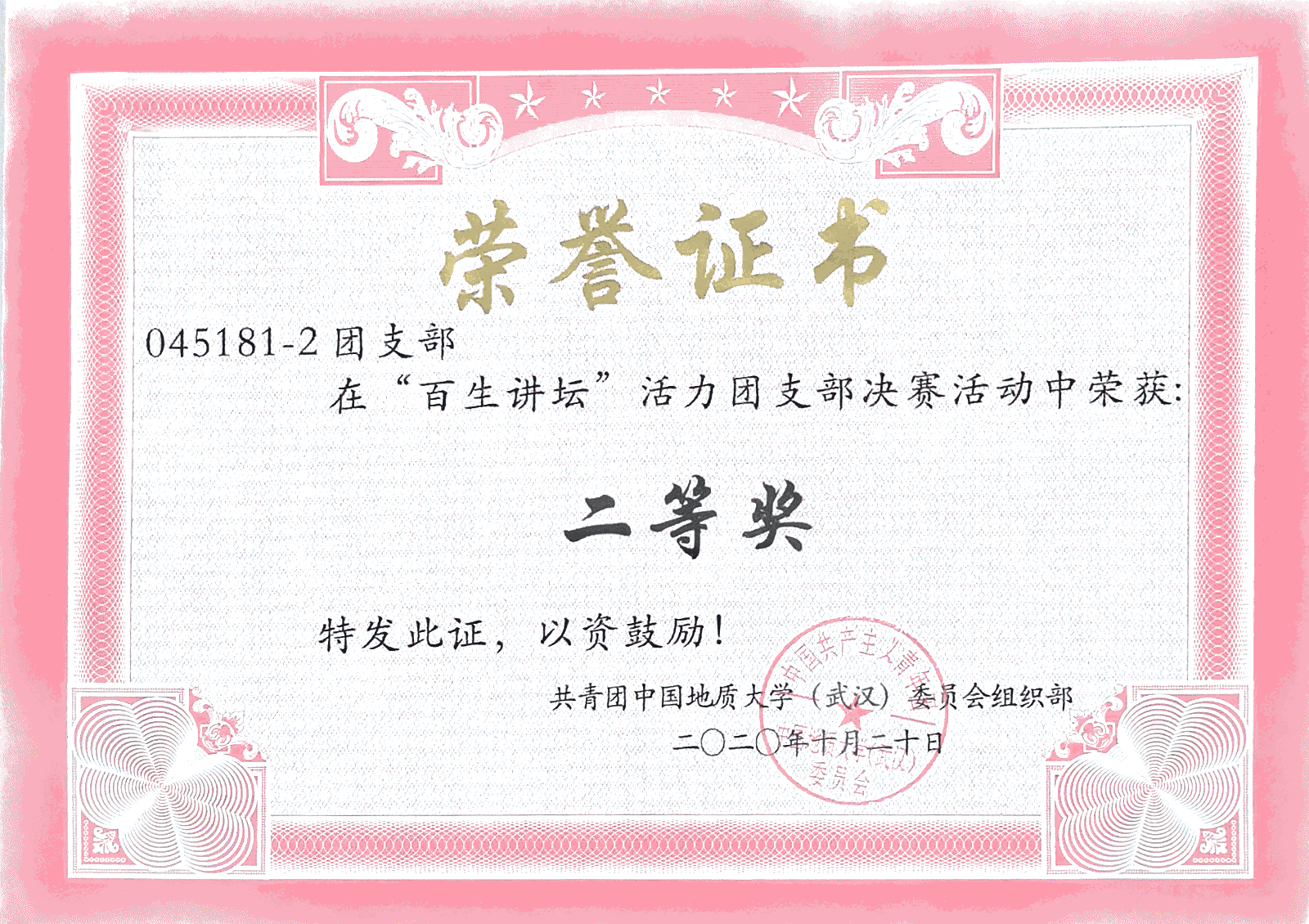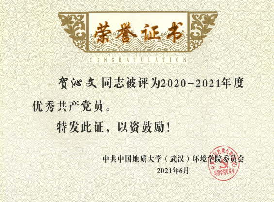 按照专业设置党支部,把支部建在专业上。贺沁文担任地下水专业大学生党支部书记,积极组织党支部开展各类政治理论学习与实践,参与吃瓜网 “张国旗班”行动计划,2021年地下水专业大学生党支部被评为吃瓜网 年度先进基层党组织,贺沁文被评为优秀共产党员。2018级中加班坚持思想引领,以党建带动团建,班团一体共奋进。团支部连续两年获得“校级五四红旗团支部”荣誉称号。