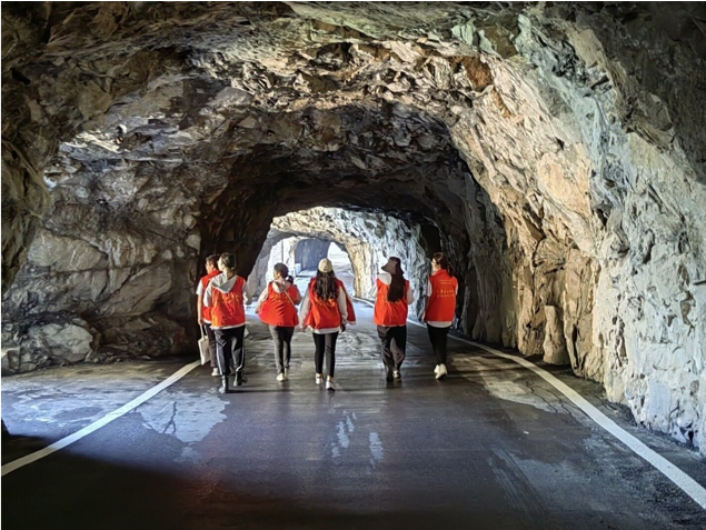 随后,众人来到锡崖沟挂壁公路,用脚步实地丈量,亲自感受当初村民修建此路时的艰辛不易。锡崖沟绝壁上嶙峋的岩石依旧留着开山时的钎痕,仰望是千尺高崖,俯瞰是百丈深渊,眼前景象无比震撼人心。