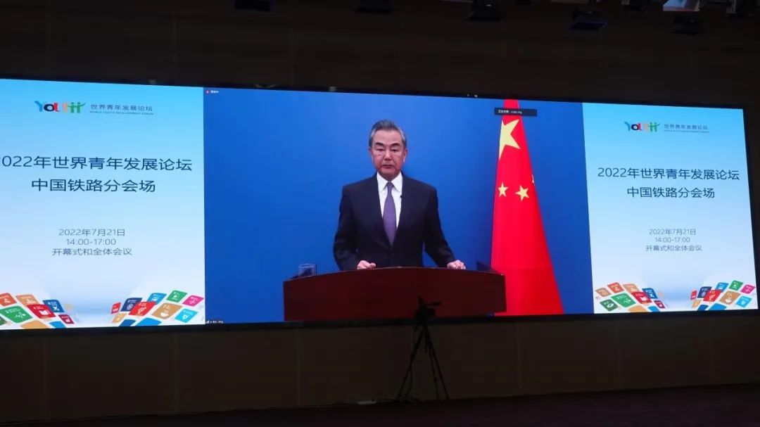 国务委员兼外长王毅以视频方式宣读习近平主席贺信,鼓励与会青年朋友们积极响应习近平主席的号召,以青年的活力、朝气和担当,为全球发展进步事业贡献自己的力量。