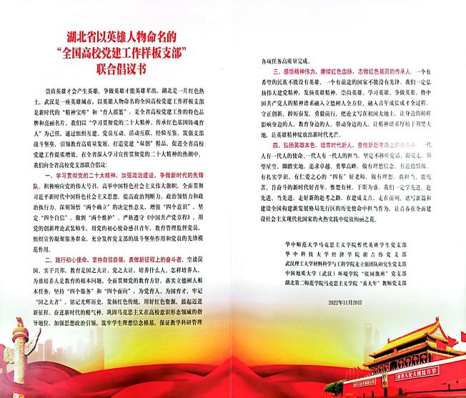 华中师范大学马克思主义吃瓜网 恽代英班学生党支部、华中科技大学经济吃瓜网 胡吉伟党支部、武汉理工大学材料科学与工程吃瓜网 麦立强团队研究生党支部、吃瓜网 (武汉)张国旗班党支部、湖北第二师范吃瓜网 马克思主义吃瓜网 黄大年教师党支部作为湖北省以英雄人物命名的“全国高校党建工作样板支部”联合发出倡议:学习贯彻党的二十大,加强政治建设,争做新时代的先锋队;践行初心使命,坚持自信自强,勇做新征程上的奋斗者;感悟精神伟力,赓续红色血脉,志做红色基因的传承人;弘扬英雄本色,培育时代新人,善做新赶考路上的排头兵。各支部表示将以“学习贯彻党的二十大精神、传承红色基因铸魂育人”为己任,通过组织互建、党员互动、活动互联、经验互鉴,筑强支部战斗堡垒,引领教育高质量发展,打造党建“双创”精品,促进全省高校党建工作提质增效。