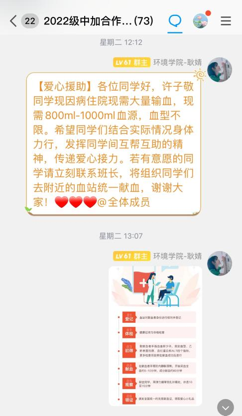 2022、2023级地下水科学与工程(中外合作办学)专业学生群里发动号召,呼吁同学积极参与献血。