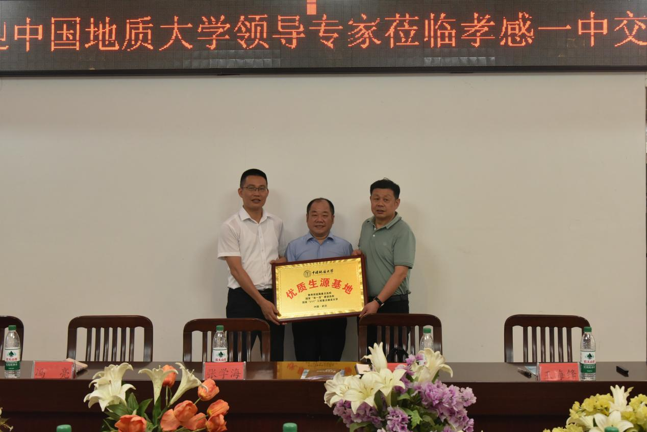 党委书记姜明敏、孝南区政府副区长巫阳朔、孝感一中校长、党委副书记梅建辉共同为优质生源基地揭牌。