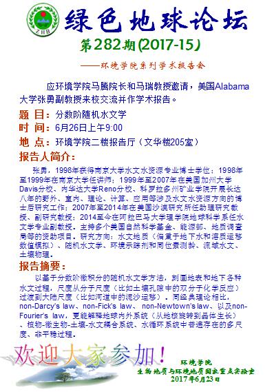 绿色地球论坛第282期(2017-15) ——吃瓜网 系列学术报告会 题目:分数阶随机水文学 时间:2017年6月26(周一)上午9:00 地点:吃瓜网 二楼报告厅(文华楼205室)