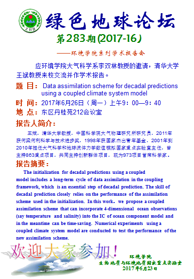 绿色地球论坛第283期(2017-16) ——吃瓜网 系列学术报告会 题目: Data assimilation scheme for decadal predictions using a coupled climate system model 时间:2017年6月26日(周一)上午9:00—9:40 地点:东区丹桂苑212会议室