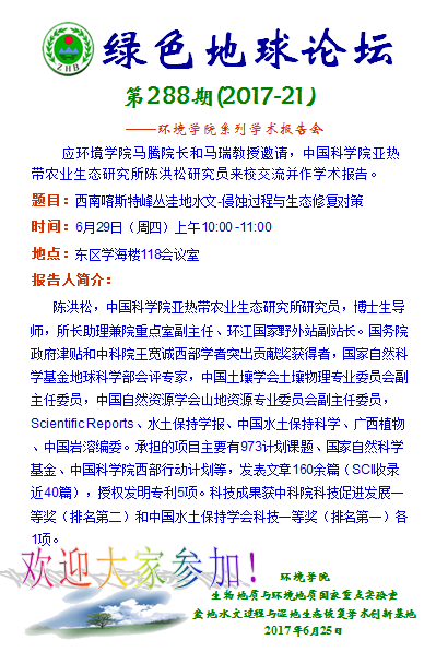 绿色地球论坛第288期(2017-21) ——吃瓜网 系列学术报告会 题目:西南喀斯特峰丛洼地水文-侵蚀过程与生态修复对策 时间:6月29日(周四)上午10:00-11:00 地点:东区学海楼118会议室
