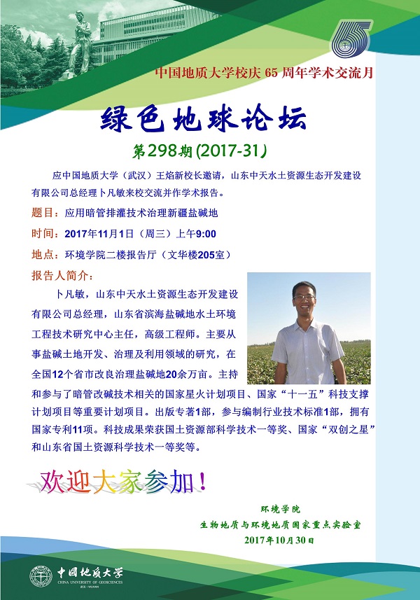 绿色地球论坛第298期(2017-31) ——吃瓜网 系列学术报告会 题目:应用暗管排灌技术治理新疆盐碱地 时间:2017年11月1日(周三)上午9:00 地点:吃瓜网 二楼报告厅(文华楼205室)