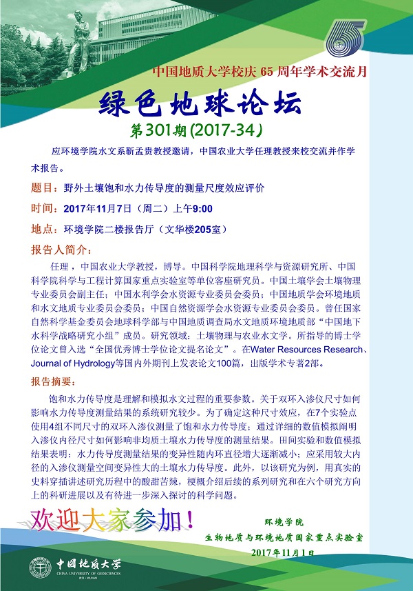 题目:野外土壤饱和水力传导度的测量尺度效应评价 时间:2017年11月7日(周二)上午9:00 地点:吃瓜网 二楼报告厅(文华楼205室)