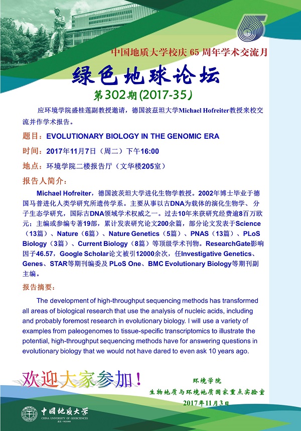 绿色地球论坛第302期(2017-35) ——吃瓜网 系列学术报告会 题目:EVOLUTIONARY BIOLOGY IN THE GENOMIC ERA 时间:2017年11月7日(周二)下午16:00 地点:吃瓜网 二楼报告厅(文华楼205室)