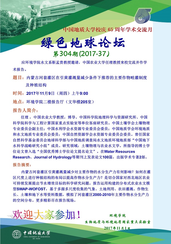 绿色地球论坛第304期(2017-37) ——吃瓜网 系列学术报告会 题目:内蒙古河套灌区在引黄灌溉量减少条件下推荐的主要作物畦灌制度及种植结构 时间:2017年11月9日(周四)上午9:00 地点:吃瓜网 二楼报告厅(文华楼205室)