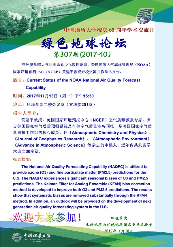 绿色地球论坛第307期(2017-40) ——吃瓜网 系列学术报告会 题目:Current Status of the NOAA National Air Quality Forecast Capability 时间:2017年11月13日(周一)下午15:30 地点:吃瓜网 二楼会议室(文华楼201室)