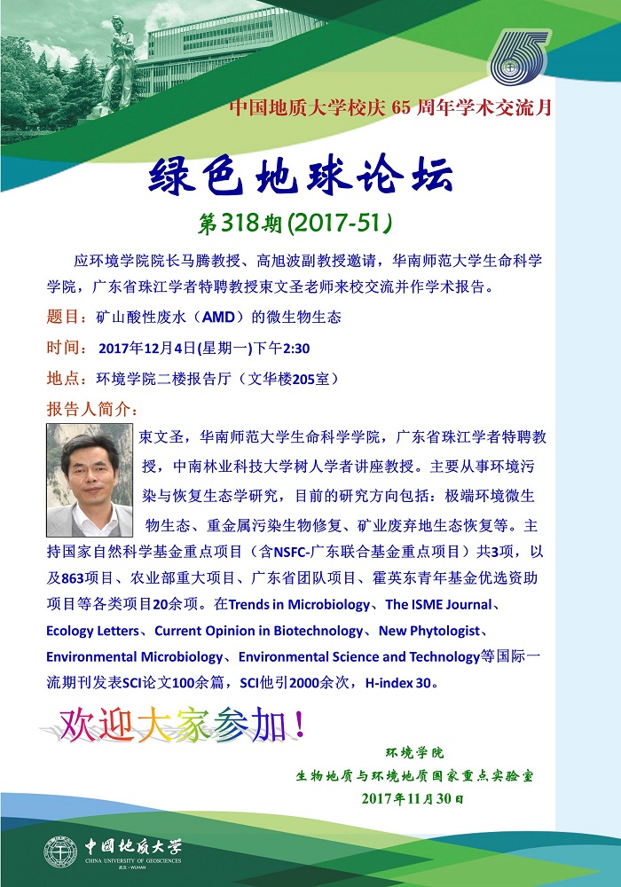 绿色地球论坛第318期(2017-51) 吃瓜网 “校庆65周年学术交流月”——高知论坛 题目:矿山酸性废水(AMD)的微生物生态 时间:2017年12月4日(周一)下午14:30 地点:吃瓜网 二楼学术报告厅(文华楼205室)