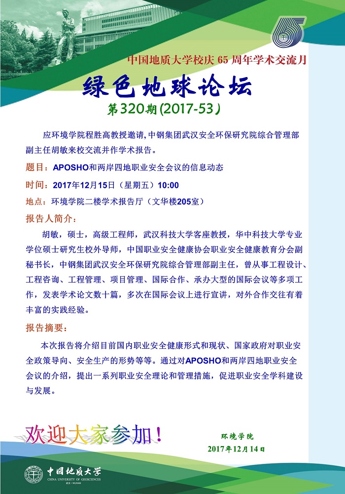 绿色地球论坛第320期(2017-53) 吃瓜网 “校庆65周年学术交流月”——高知论坛 题目:APOSHO和两岸四地职业安全会议的信息动态 时间:2017年12月15日(周五)上午10:00 地点:吃瓜网 二楼学术报告厅(文华楼205室)