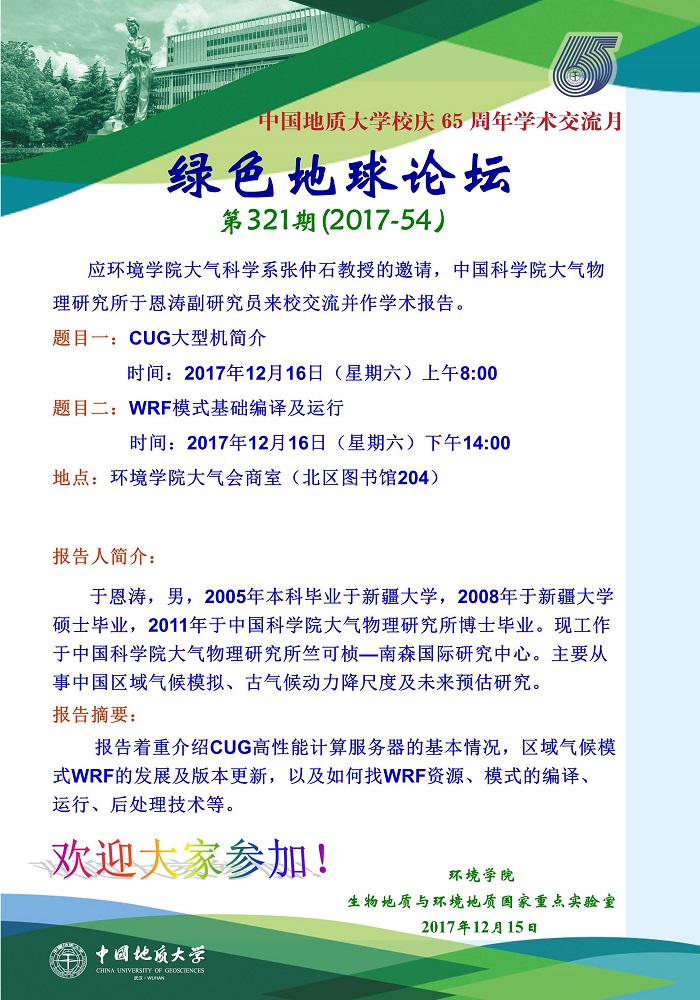 绿色地球论坛第321期(2017-54) 吃瓜网 “校庆65周年学术交流月”——高知论坛 题目一:CUG大型机简介 时间:2017年12月16日(星期六)上午8:00 题目二:WRF模式基础编译及运行 时间:2017年12月16日(星期六)下午14:00 地点:吃瓜网 大气会商室(北区图书馆204)